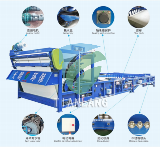 The belt filter press is mainly composed of a driving device, a frame, a press roll, an upper filter belt, a lower filter belt, a filter belt tensioning device, a filter belt cleaning device, a discharge device, an air control system, and an electrical control system.
